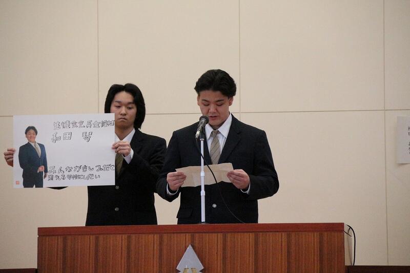 立会演説会では、各候補者が『要望や質問などをできるだけ実現する』、『メリハリのある学校にしたい』と、学校をより良くするための公約を述べるなど、活発な演説会となりました。