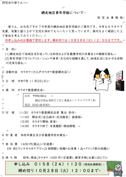 今回は網走地区青年学級のご案内です。日頃お仕事などで疲れた体をリフレッシュしませんか?同窓生と一緒にカラオケで盛り上がりましょう!